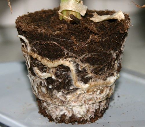 Het potje waar hij in stond werd te klein, dus tijd om te verpotten. Een mooi moment om even zijn wortels te inspecteren. Nou, afgezien van het ruimtegebrek, zien ze er prima uit! |