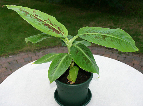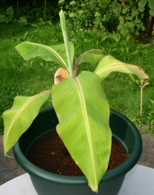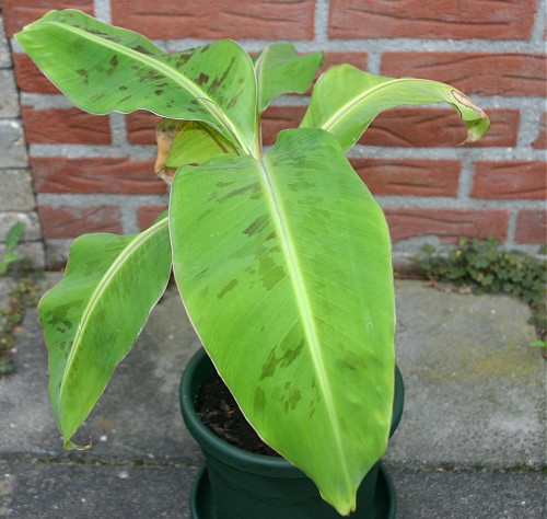 21-3-2010: Zo heb ik de bananenplant van een aardige collega gekregen. Het is een stekje dat van de moederplant af is gehaald. 10-4-2010: Er zijn in de tijd dat ie van de moederplant is weggehaald 2 bladeren afgestorven, maar er is ook weer een nieuw blad gegroeid. Zie in het midden bovenaan. 21-4-2010: Het vorige nieuwe blad is van deze kant af gezien naar links gaan hangen, en het volgende blad is al weer in de maak. 27-4-2010: En wát voor een blad! 4-5-2010: 13-5-2010: Elk nieuw blad is groter dan het vorige. 22-5-2010: Hij groeit als kool! |