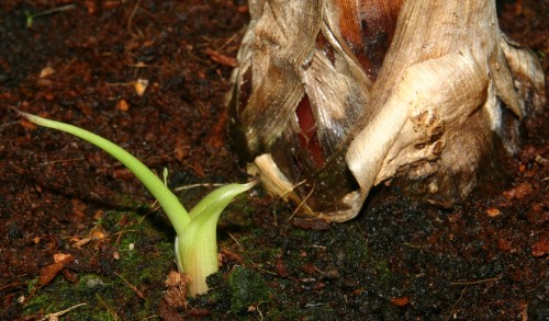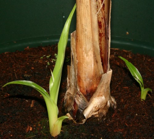 Dit is een van de twee kleine uitlopers die naast de stam van de plant uit de grond komen. Een gezond teken. Maar ik denk dat ik 'm er binnenkort af ga halen en iemand kado ga doen, anders heb ik zometeen de hele kamer vol staan! De plant staat nu al weer ruim 2 weken binnen voor het raam. |