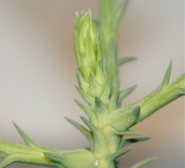 Ongeveer sinds half mei zijn er weer tekenen van groei zichtbaar. Zie hier het topje waarvan het lichtgroene deel nieuw is. |