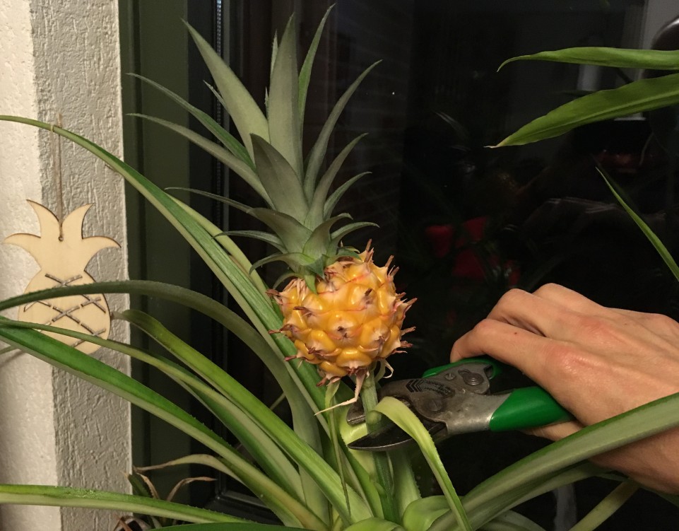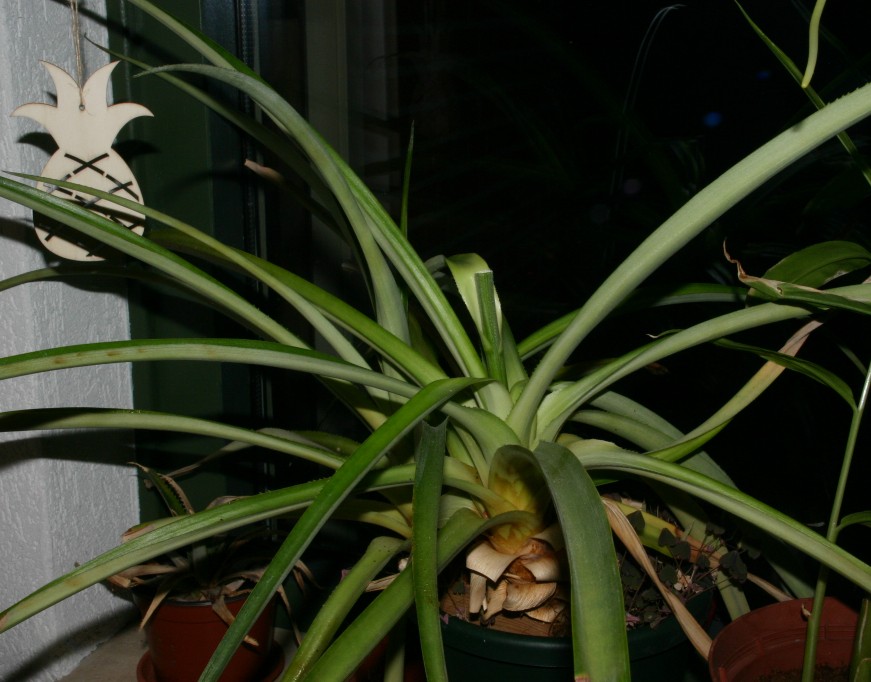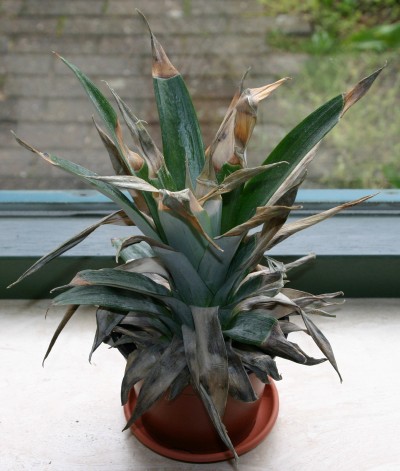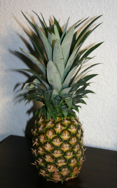 Bij de lokale Albert Hein een ananas uitgezocht met een mooie kruin. De herkomst is Costa Rica. |