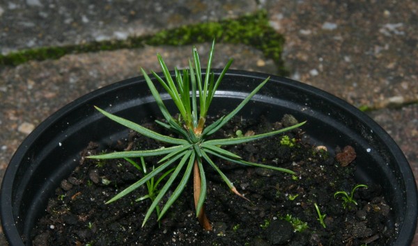 Al mijn Arveboompjes op een rij in een nieuw potje. Van links naar rechts: 1, 2, 5, 7. |