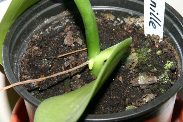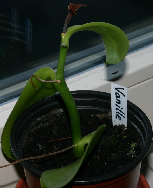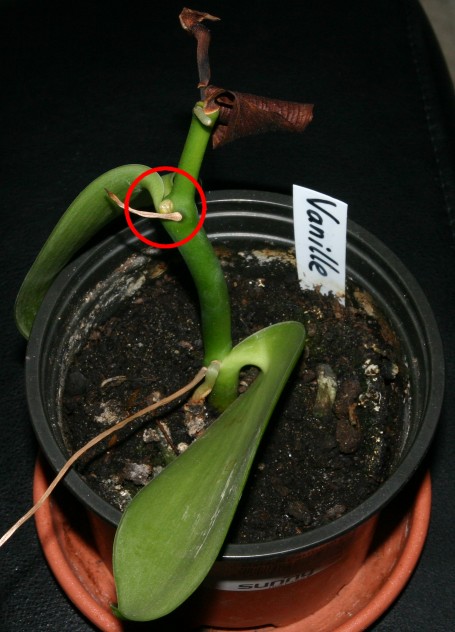 Deze stek was de top van mijn eerste vanilleplant die ik een paar maanden geleden had afgeknipt. De jongste blaadje is afgestorven, maar bij de onderste knoop zie je het begin, van wat ik denk een worteltje gaat worden. |